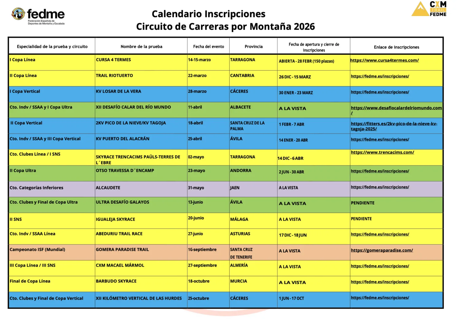 Existen tres modalidades de carreras por montaña dentro de la FEDME: carreras en LÍNEA o SKY (con distintas distancias y por distintos terrenos en la montaña), VERTICAL y ULTRA.