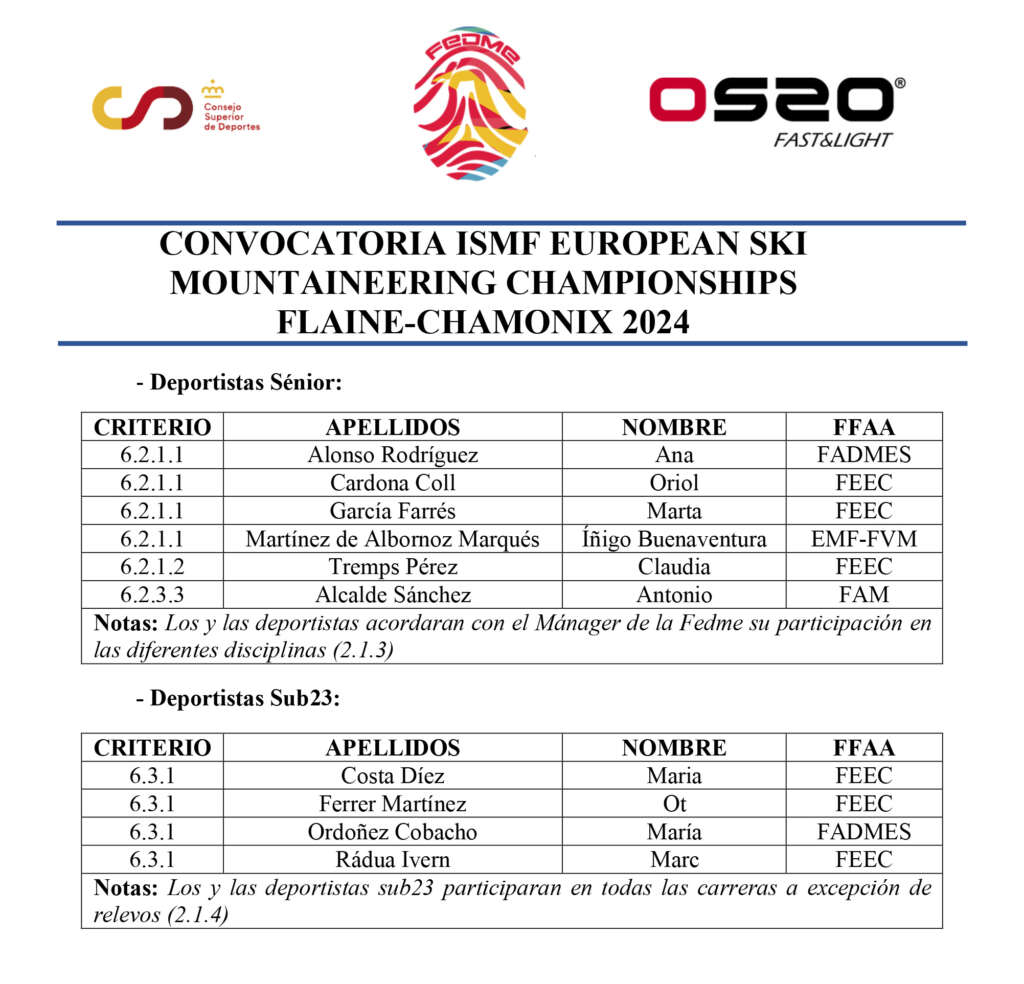De acuerdo con los criterios publicados en la web FEDME el pasado 14 de noviembre de 2023, se hace oficial el equipo seleccionado: