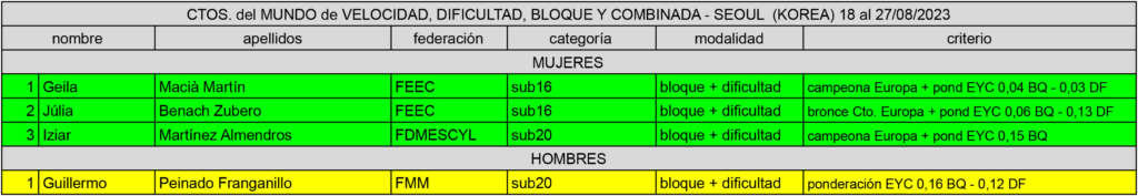 Se hace oficial la convocatoria para los CAMPEONATOS del MUNDO JUVENIL de VELOCIDAD, DIFICULTAD, BLOQUE Y COMBINADA, que tendrán lugar en la localidad coreana de Seoul entre los días 18 a 27 de agosto de 2023.