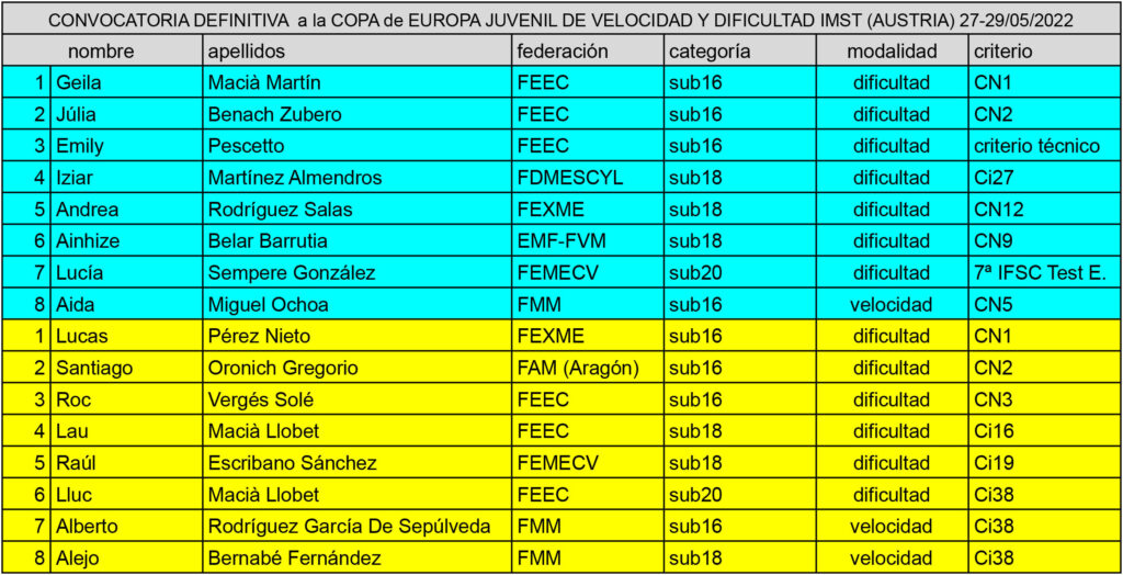 Se hace oficial la convocatoria para la Copa de Europa Juvenil de velocidad y dificultad que se celebrará en Imst (Austria) entre los días 27 y 29 de mayo.