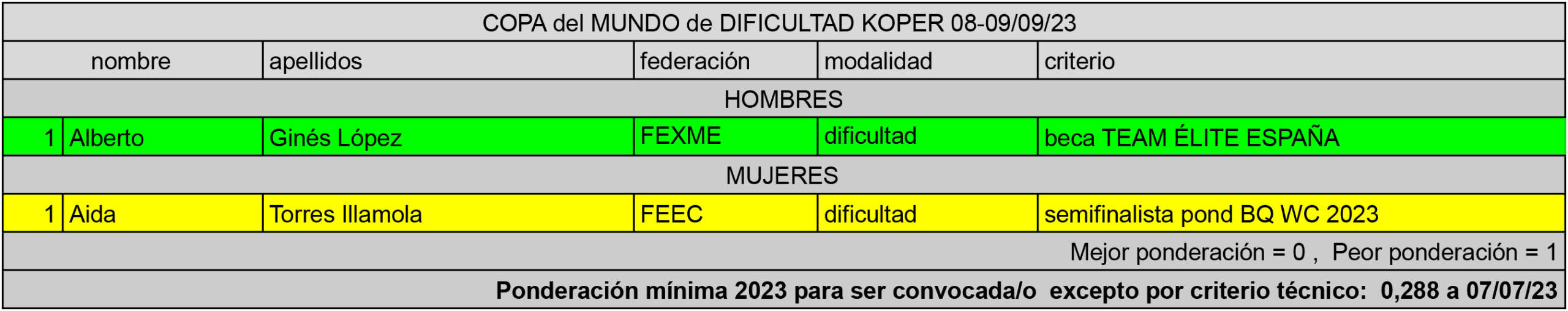 Tabla de Criterios de Clasificación para las selecciones nacionales de Escalada en Categorías juveniles (sub 16 y sub18)