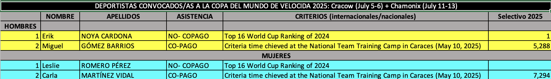 La selección española de escalada realiza la convocatoria de 4 deportistas, para competir en las copas del Mundo de Velocidad de Cracow (5 y 6 de julio) y Chamonix (11 y 13 de julio).