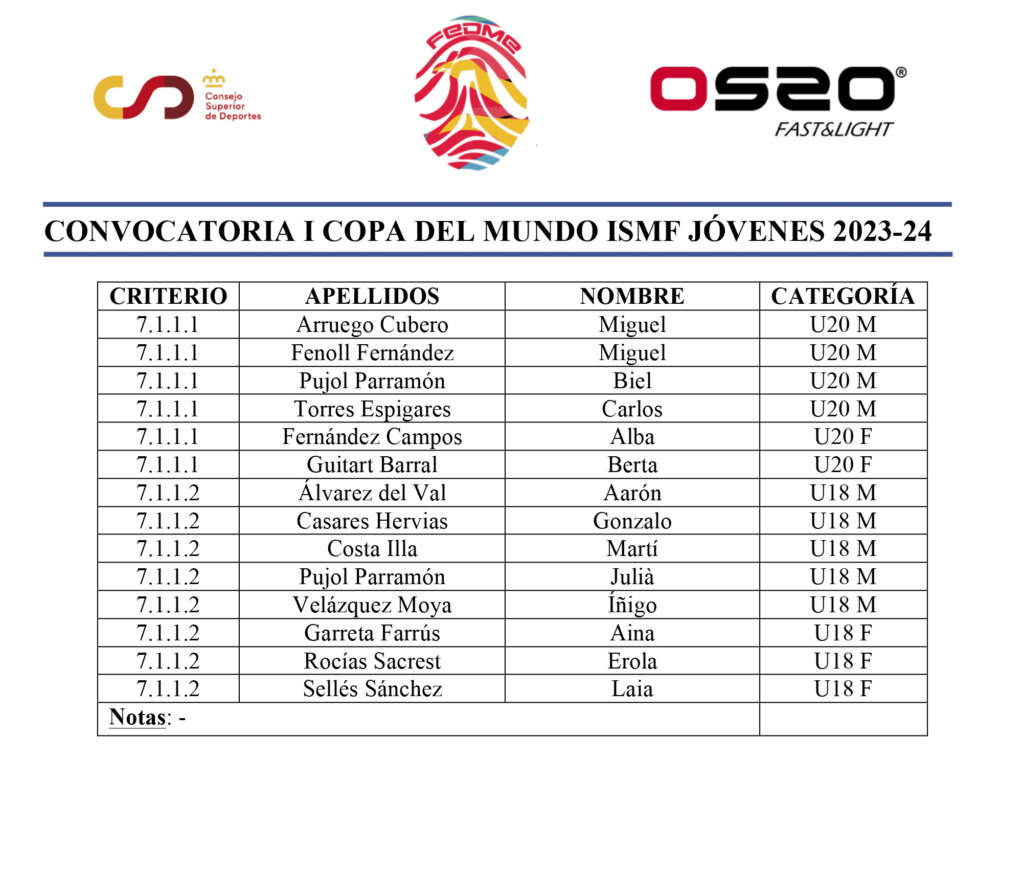 De acuerdo con los criterios publicados en la web FEDME el pasado 14 de noviembre de 2023, se hace oficial el equipo seleccionado: