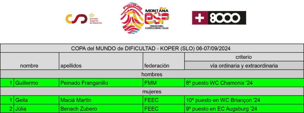 Se hace oficial para la COPA del MUNDO de DIFICULTAD que tendrá lugar en la localidad eslovena de Koper, del 6 al 7 de septiembre de 2024.