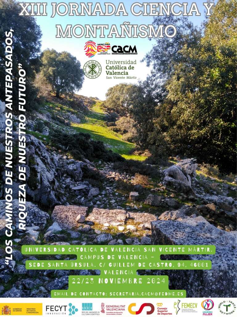 El pasado 22 y 23 de noviembre tuvo lugar la XIII Jornada Ciencia y Montañismo dedicada a la defensa de los Caminos Públicos y Vías Pecuarias, en la Universidad Católica de Valencia San Vicente Mártir y organizada por el Consejo Asesor Científico de las Montañas de la FEDME. Un espacio de encuentro para investigadores, profesionales y gestores del sector que han presentado los últimos avances científicos y compartido sus experiencias.