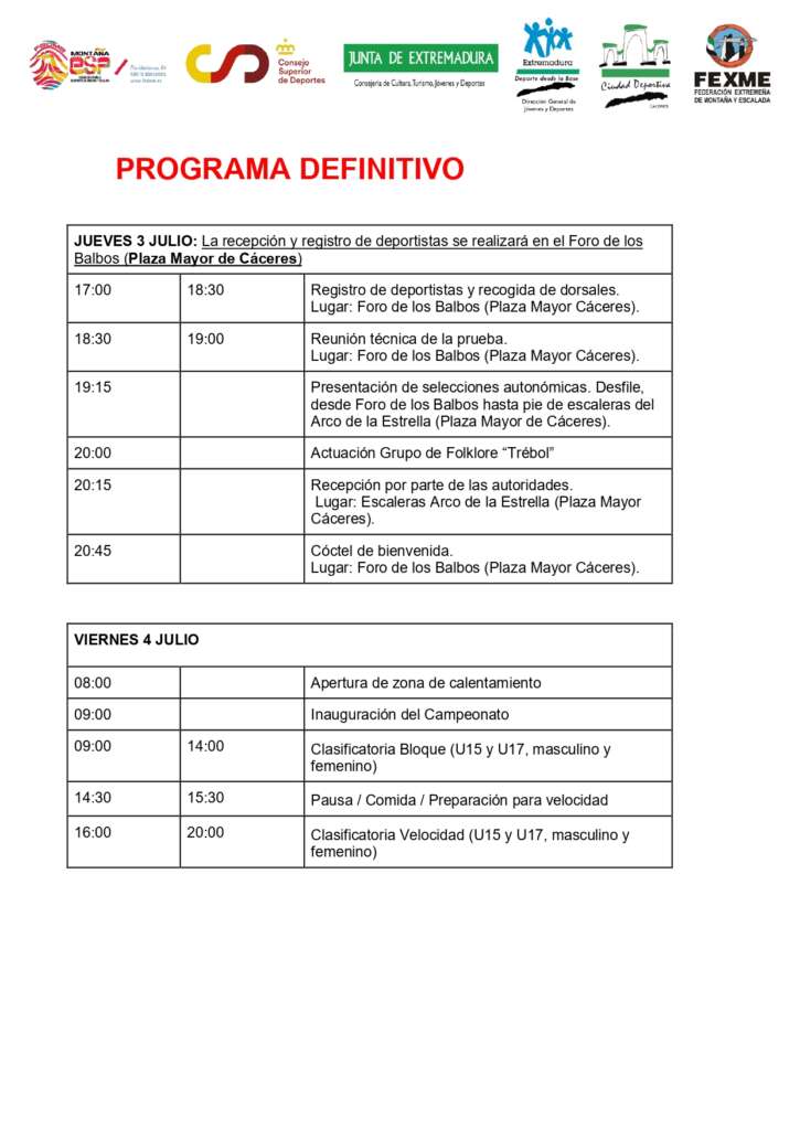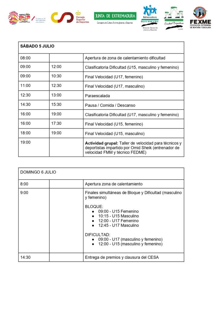 En dos días arranca el CESA de Escalada 2025. Este jueves, Cáceres, reunirá a los mejores deportistas escolares de todo el país. Las categorías U15, U17 y Paraescalada competirán para decidir el título de la temporada 2025, en una competición que finalizará el domingo 6 de julio.