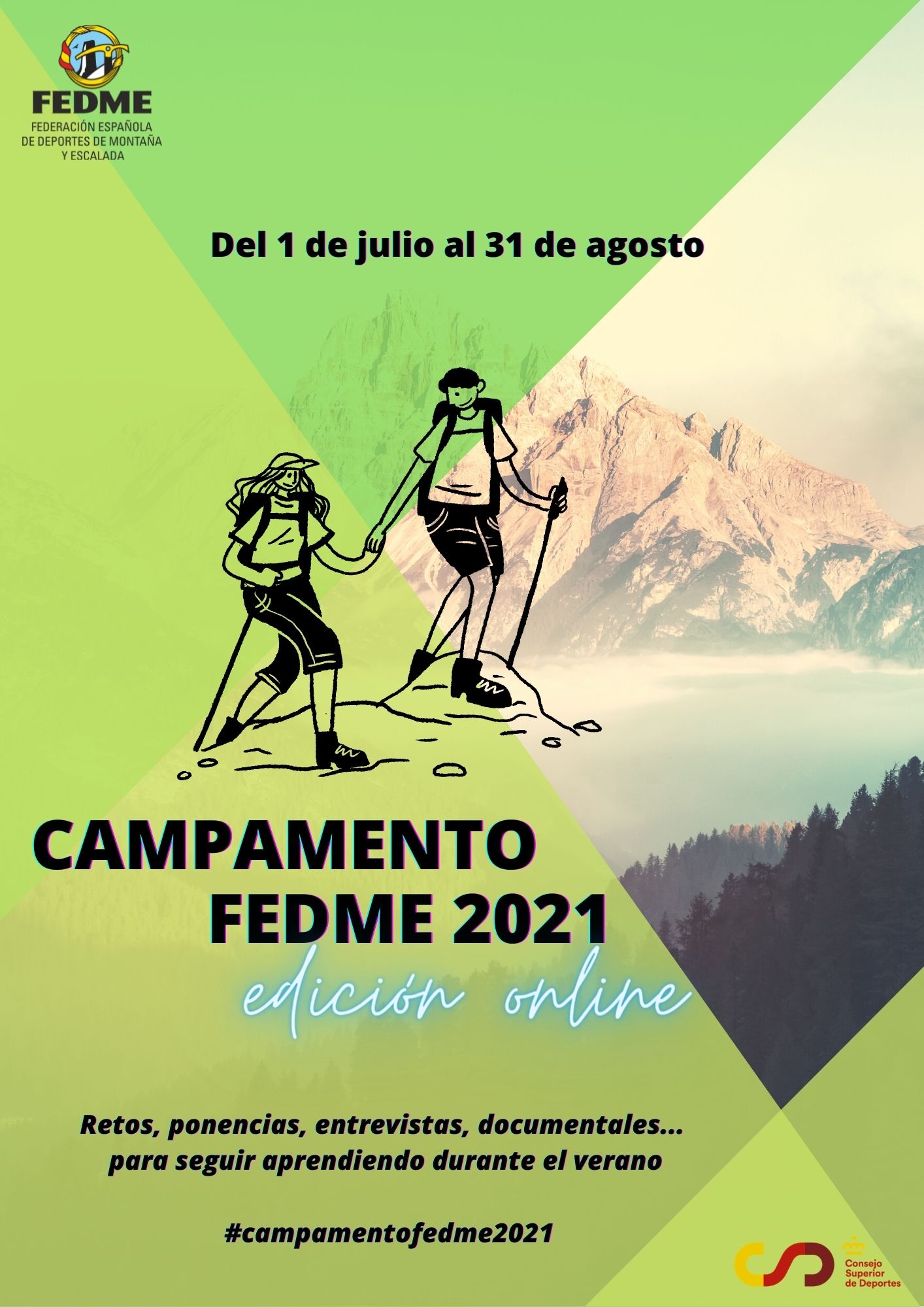Por eso desde el área Sociedad, Infancia y juventud se ha optado por una programación virtual durantetodo el verano que difunda los valores del montañismo propios del Campamento FEDME y generar a su vez actividad en todo el territorio.  En definitiva, una actividad de verano, propia de la FEDME, para la promoción de los valores y los deportes de montaña a todos los niveles.