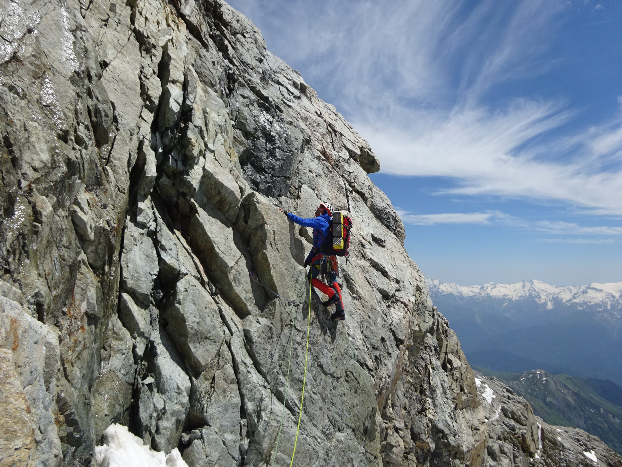 La idea era escalar la vía Gregory y la vía Mishialev, pero las condiciones finalmente aconsejaron realizar un cambio de planes dado que la montaña estaba muy cargada de nieve reciente y el calor produjo grandes regueros de agua en muchas secciones de la pared, por lo que fue aconsejable huir de las campas de nieve y acometer con seguridad de madrugada dichas secciones. Observamos un pilar rocoso limpio de nieve y de orientación suroeste que nos pareció la opción más segura. Después de indagar varias alternativas las 3 cordadas seguimos el mismo itinerario. De los primeros 700 metros no tuvimos datos ni encontramos ningún rastro de material. Escalamos unos 15 largos de roca con dificultades de hasta 6a/b máximo y vivaqueamos a unos 4.000 en un promontorio de ensueño, al resguardo de las avalanchas que caían por las canales. Al día siguiente a las 4.00 am el grupo se puso en marcha para superar el tramo de nieve con seguridad y giramos a la izquierda, buscando la mejor salida del muro final. No estuvimos seguros por que via salíamos pero creemos que estábamos a la derecha de la via Mishialev. Aquí escalamos 3 difíciles largos de roca, 6b+ max y uno de mixto para acceder a la arista final llena de cornisas y nieve difícil. Hicimos cumbre con buen tiempo y una gran sensación de alegría por haber conseguido esta difícil cumbre.
