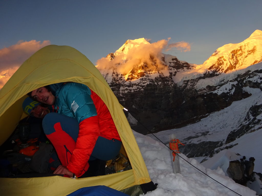 Al día siguiente dando traspiés, llegan al campo base. Aun les quedan dos días antes de la llegada de los porteadores. Sus compañeros de expedición aprovecharán para abrir una bonita vía de roca en un pico cercano al campo base, a pesar de tener los pies con el hormigueo típico que deja el intenso frío.