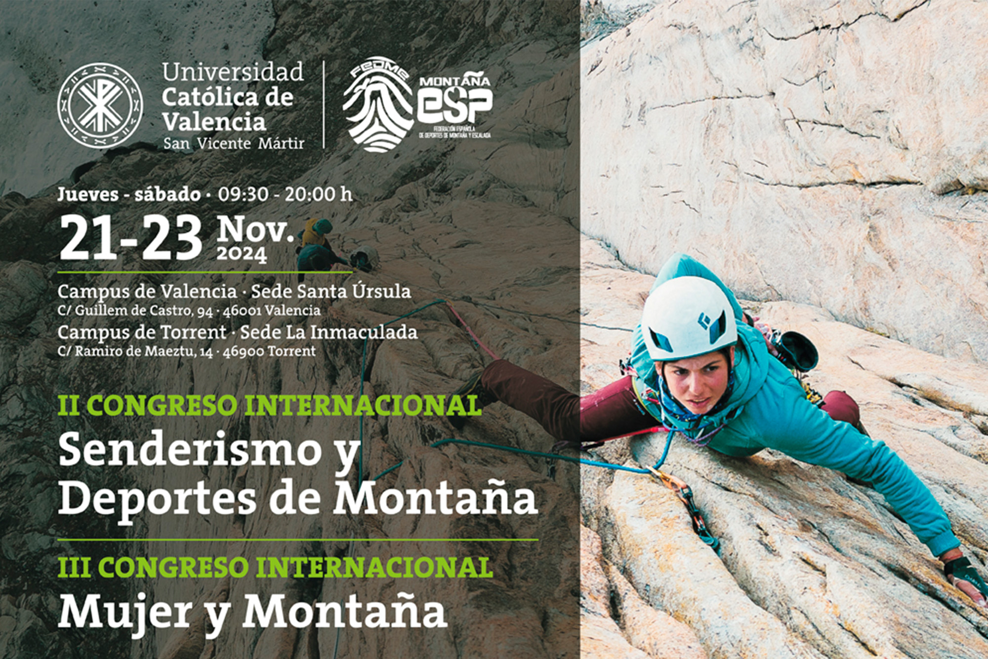 La Universidad Católica de Valencia (UCV) junto a la Federación Española de Deportes de Montaña y Escalada (FEDME) y la Federació d’Esports de Muntanya i Escalada de la Comunitat Valenciana (FEMECV), celebrará en conjunto este año el «III Congreso Internacional Mujer y Montaña» y el «II Congreso Internacional de Senderismo y Deportes de Montaña«, los días 21, 22 y 23 de noviembre, organizados por la Facultad de Ciencias de la Actividad Física y del Deporte (CAFD).