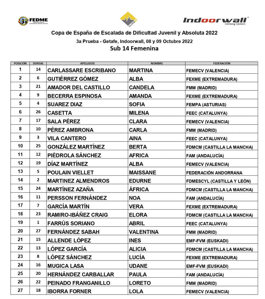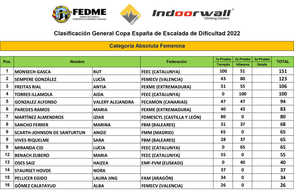 La competición que premia la regularidad nos deja un final de Copa de España de Escalada de Dificultad Juvenil y Absoluta 2022 liderada por Milena Casetta y Bernat Munne (Sub14), Geila Macià y Manuel Pastor (Sub16), Ana Torregrosa y Joanes Esparta (Sub18), Garazi Gurutxaga y Dídac Zamora (Sub20), Rut Monsech y Lluc Macià (Absoluta)