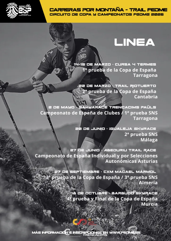 La Federación Española de Deportes de Montaña y Escalada (FEDME) ha anunciado el calendario oficial de Carreras por Montaña (CxM Trail) para la temporada 2026, que incluye las modalidades Línea, Vertical, Ultra y Edad Escolar.