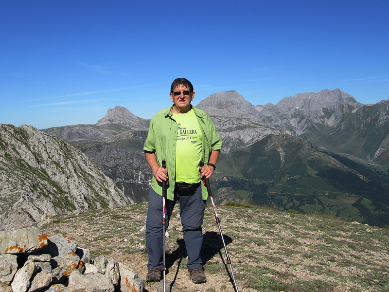 «En la imagen Ángel Fernández Ortega en una cima con sus bastones de caminar . Al fondo una cordillera de montañas calizas»