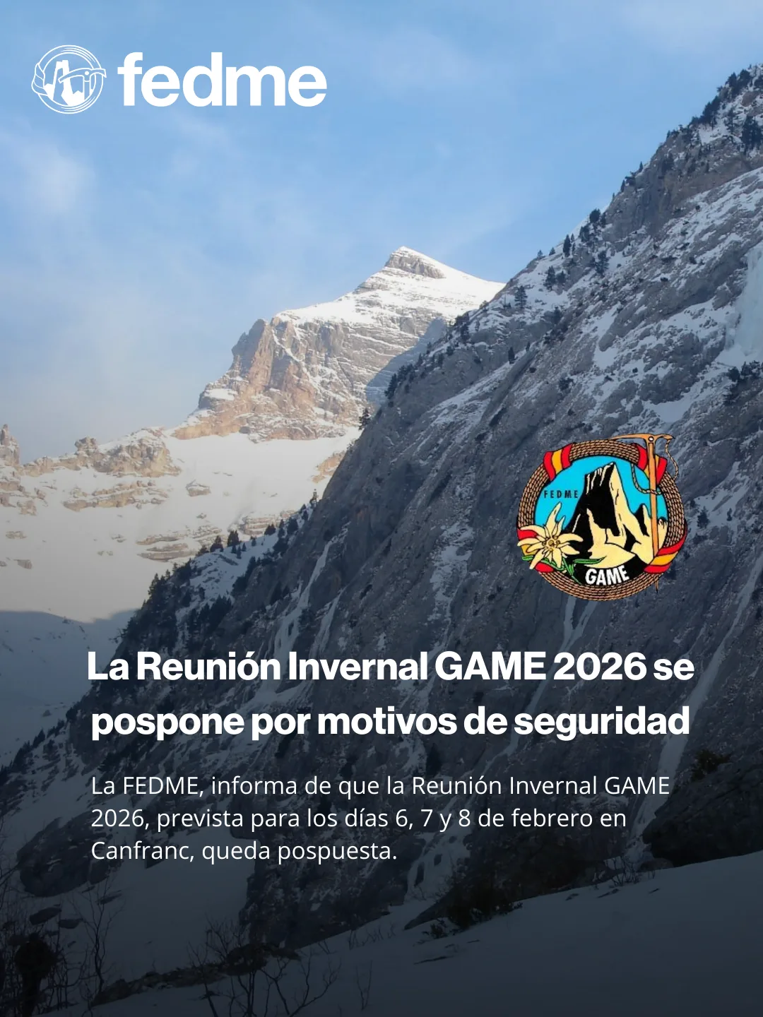 La Federación Española de Deportes de Montaña y Escalada (FEDME), a través del Grupo de Alta Montaña Español (GAME), informa de que la Reunión Invernal GAME 2026, prevista para los días 6, 7 y 8 de febrero en Canfrancqueda pospuesta. Esta decisión se ha tomado tras la evaluación de las condiciones actuales en la montaña, que no garantizan la seguridad necesaria para el desarrollo de las actividades previstas, en coherencia con los valores de prudencia y responsabilidad que definen al montañismo invernal. Desde la organización se está trabajando para valorar una posible reubicación del encuentro en nuevas fechas, siempre que las condiciones sean seguras y adecuadas para la celebración del evento. Cualquier novedad al respecto será comunicada oportunamente a través de los canales oficiales de FEDME y GAME. Las personas inscritas recibirán información detallada por correo electrónico sobre la gestión de su inscripción. Desde FEDME y GAME agradecemos la comprensión de todas las personas participantes y reafirmamos nuestro compromiso con una práctica del montañismo responsable y segura. 📩 Para más información: game@fedme.es