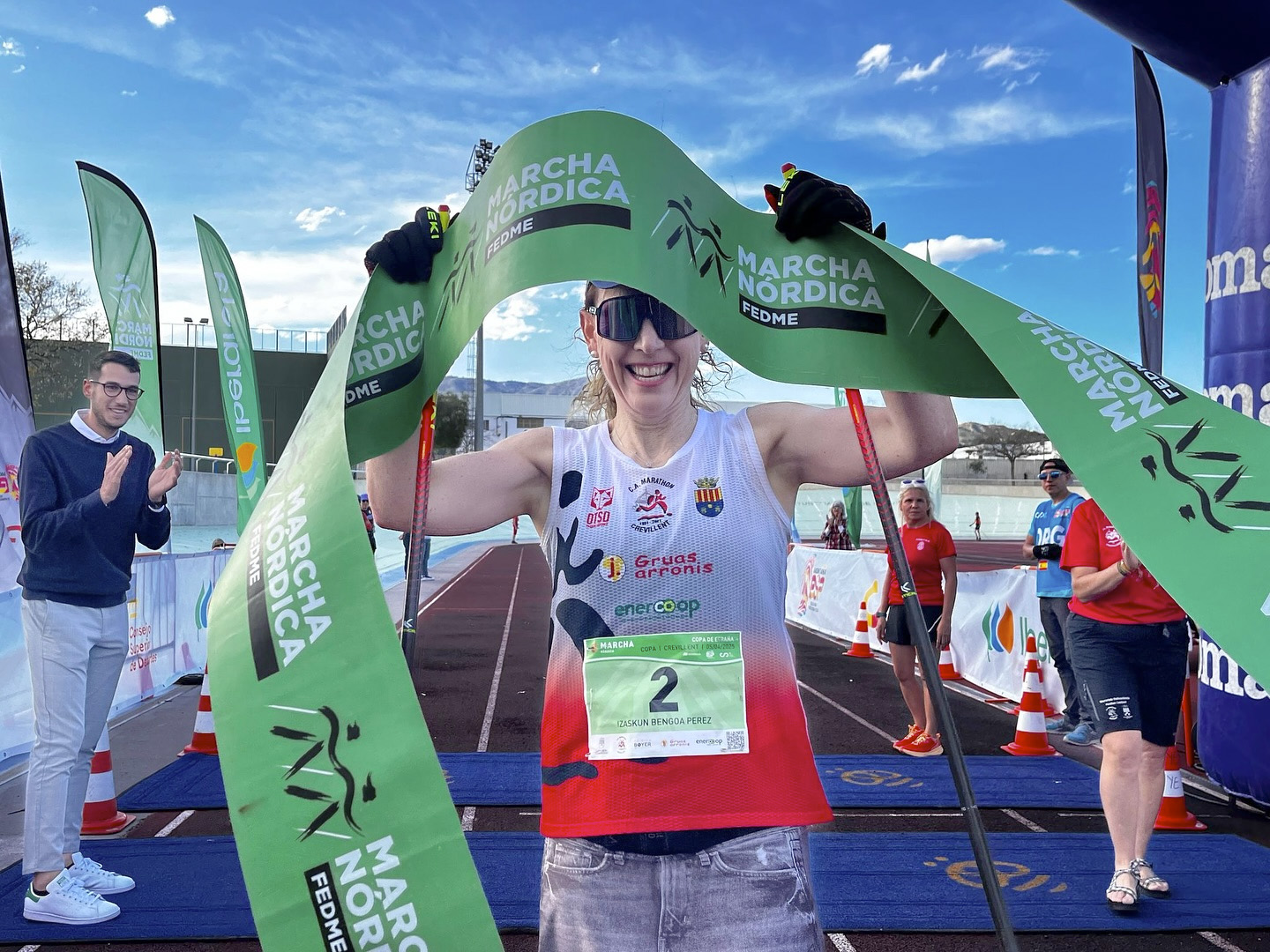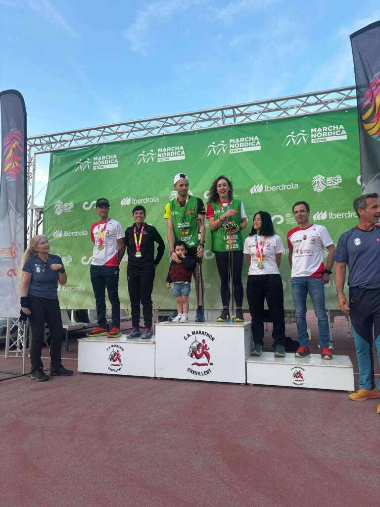Izaskun Bengoa del CA Marathon Crevillent y Pedro Romero del CD Peña Azagresa se alzan con la victoria absoluta en Crevillente, al cruzar en primera posición en la meta el sábado 7 de abril de la II prueba de la Copa Española de Marcha Nórdica FEDME 2025.