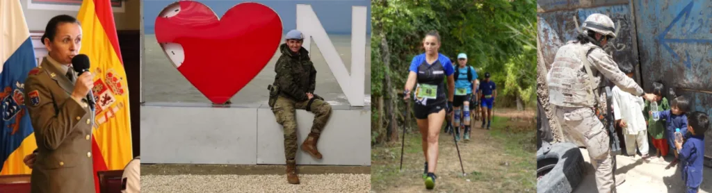 Foto 1: La Cabo 1ª Adelina Torres aparece en el centro de la foto de cintura para arriba con uniforme militar y sosteniendo un micrófono mientras da un discurso en el Gobierno de Canarias en un acto conmemorativo día de la mujer titulado “Mujeres con valor". Foto 2: La Cabo 1ª Adelina Torres aparece con uniforme militar y boina azul sentada junto a un corazón gigante en la ciudad de Naquora en El Líbano. Foto 3: La Cabo 1ª Adelina Torres aparece en el centro de la foto compitiendo en una prueba de Copa de España FEDME en Tavernes de la Valldigna este 2023. Viste camiseta y pantalón corto representando a su federación, la Federación Canaria de Montañismo FECAMON. Foto 4: La Cabo 1ª Adelina Torres aparece con uniforme de campaña, casco y su arma colgada del hombro ofreciendo botellines de agua a un grupo de niños en el pueblo afgano de Qala-e-Naw.
