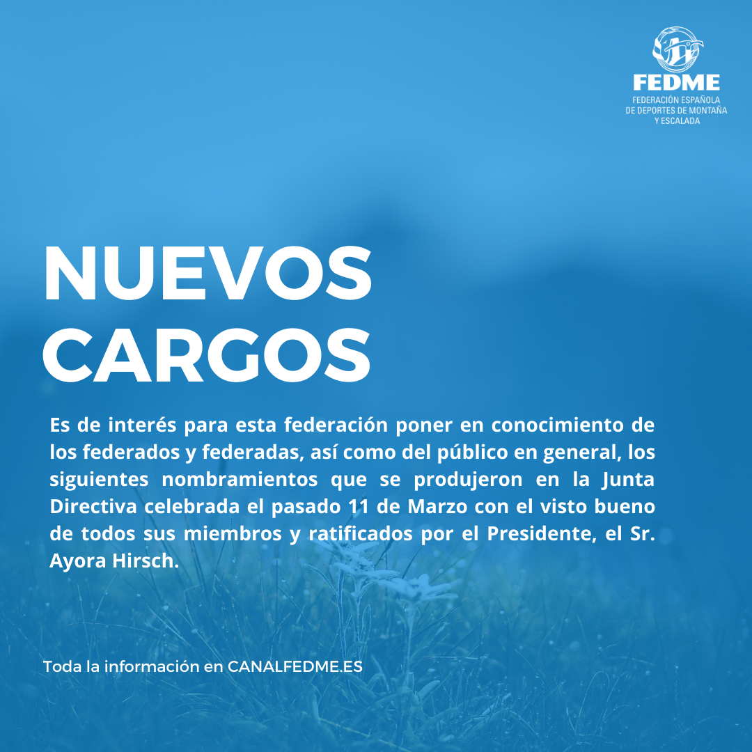 Es de interés para esta federación poner en conocimiento de los federados y federadas, así como del público en general, los siguientes nombramientos que se produjeron en la Junta Directiva celebrada el pasado 11 de Marzo con el visto bueno de todos sus miembros y ratificados por el Presidente, el Sr. Ayora Hirsch.