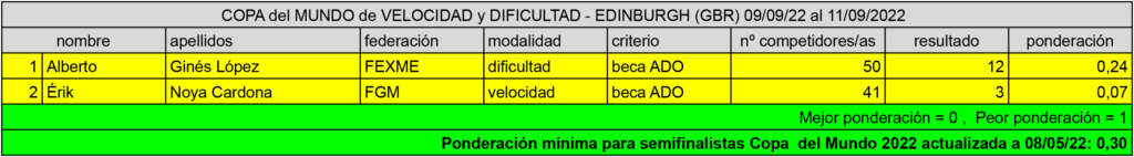 Resultados y ponderaciones de la Copa del Mundo de Dificultad y Velocidad – Edinburg (GBR) – 09/09/22 al 011/09/2022