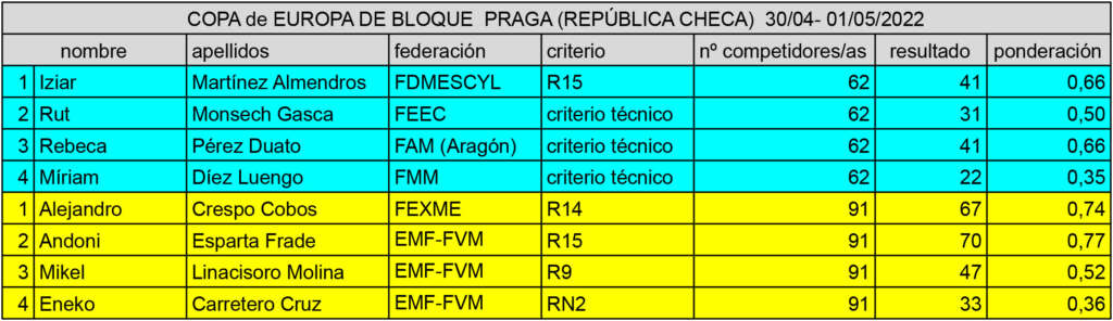 Resultados y ponderaciones de la prueba de Copa de Europa de bloque (Praga – República Checa).