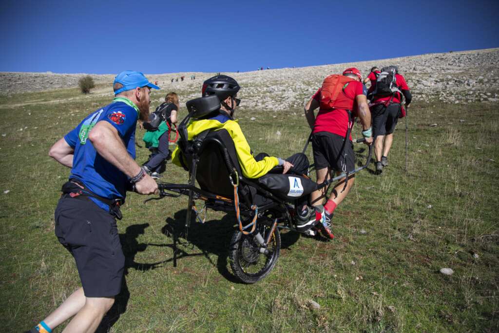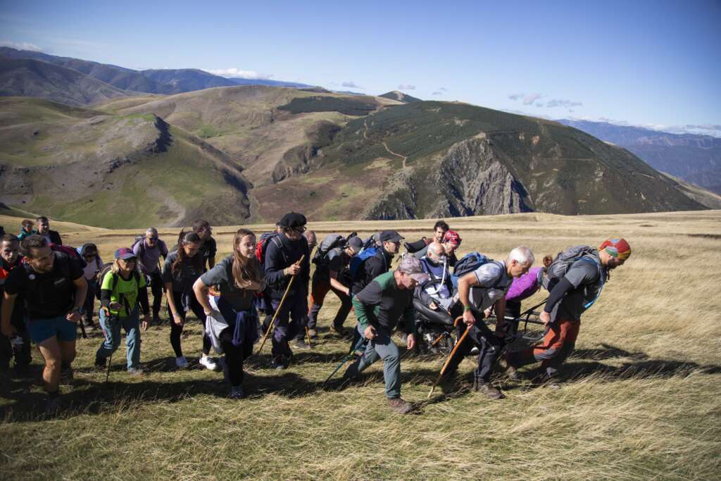 Sin embargo, esta ascensión tuvo un significado especial. Tres personas con ELA, dos de ellas transportadas en sillas joëlette, se sumaron a la aventura, demostrando una valentía y un espíritu de superación que inspiró a todos los participantes. Gracias al esfuerzo conjunto de los voluntarios y de los demás senderistas, las personas con ELA pudieron alcanzar la cima y disfrutar de las impresionantes vistas.